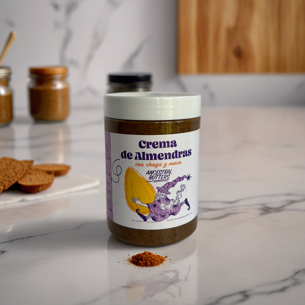 Ingredientes: crema de almendras tostadas 95%, extracto organico de chaga en polvo 2.5%, extracto de maca en polvo 2.5% Peso neto: 300 gramosBeneficios claveEnergía sostenida...