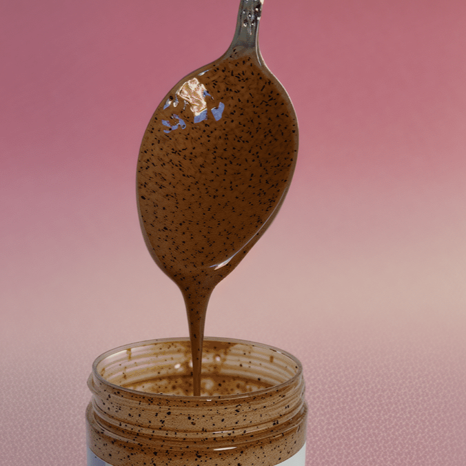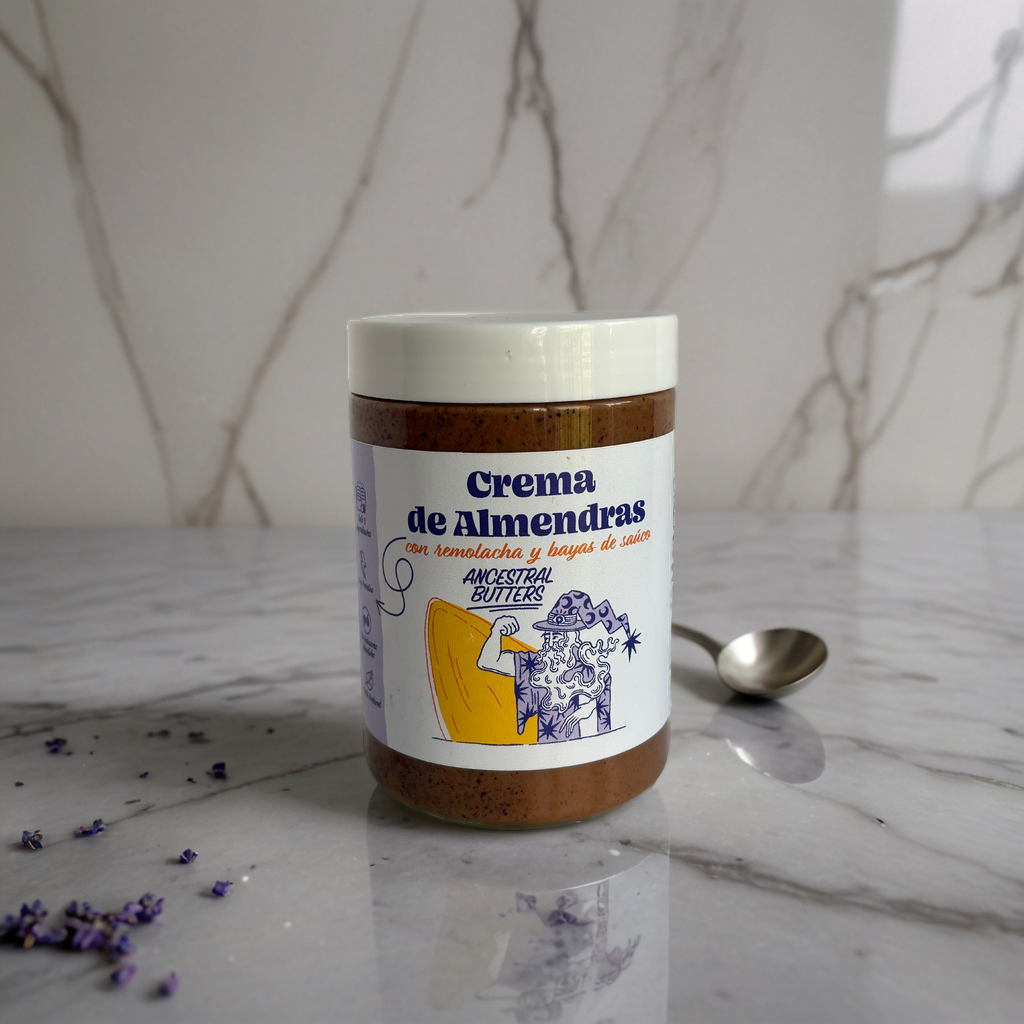 Ingredientes: crema de almendras tostadas 95%, polvo de remolacha 2.5%, extracto natural de bayas del saúco 2.5%